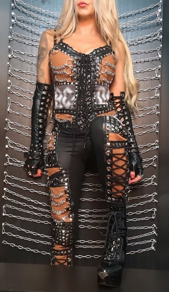 Judas Christ, one of a Kind ACDC suedette Top. Lace up adjustable front, heavily detailed with official merch, studs all over.