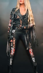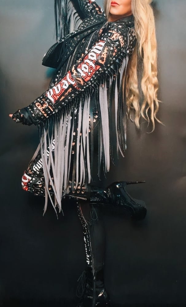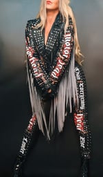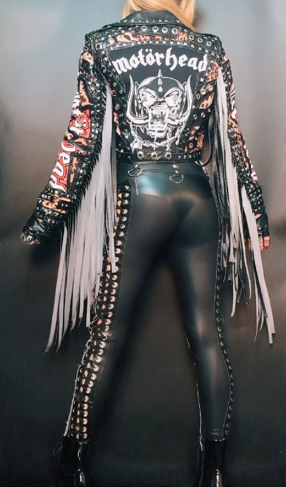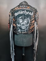 Judas Christ one of a kind Built for speed faux leather biker jacket, with Motorhead merch on the back and sleeves. Heavily detailed with rivets, zippers, graduated fringe, covered in studs.