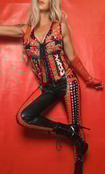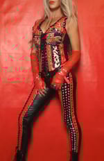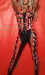 Judas Christ one of a kind wet look faux leather leggings / pants. Mid waisted, lace up front, stretchy, covered in studs and rivets with v back panel.
