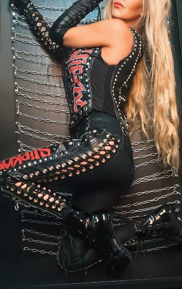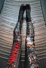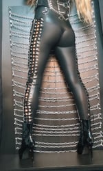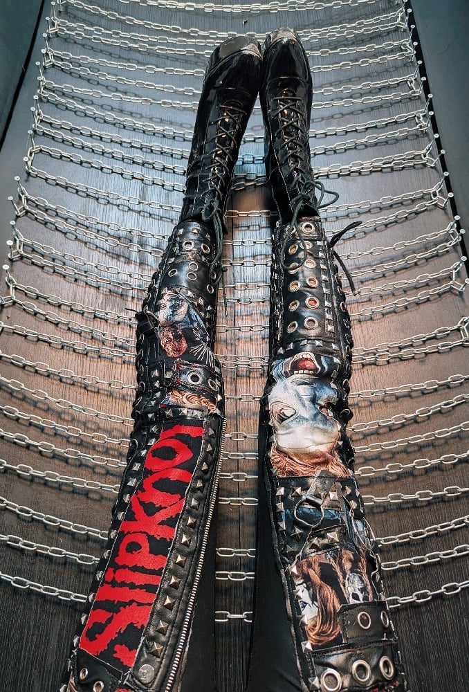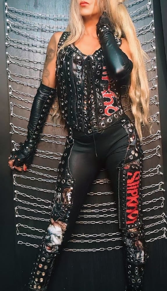 Judas Christ one of a kind Slipknot wet look faux leather leggings / pants. High waisted, lace up sides, stretchy, heavily detailed covered in studs and rivets with v back panel.