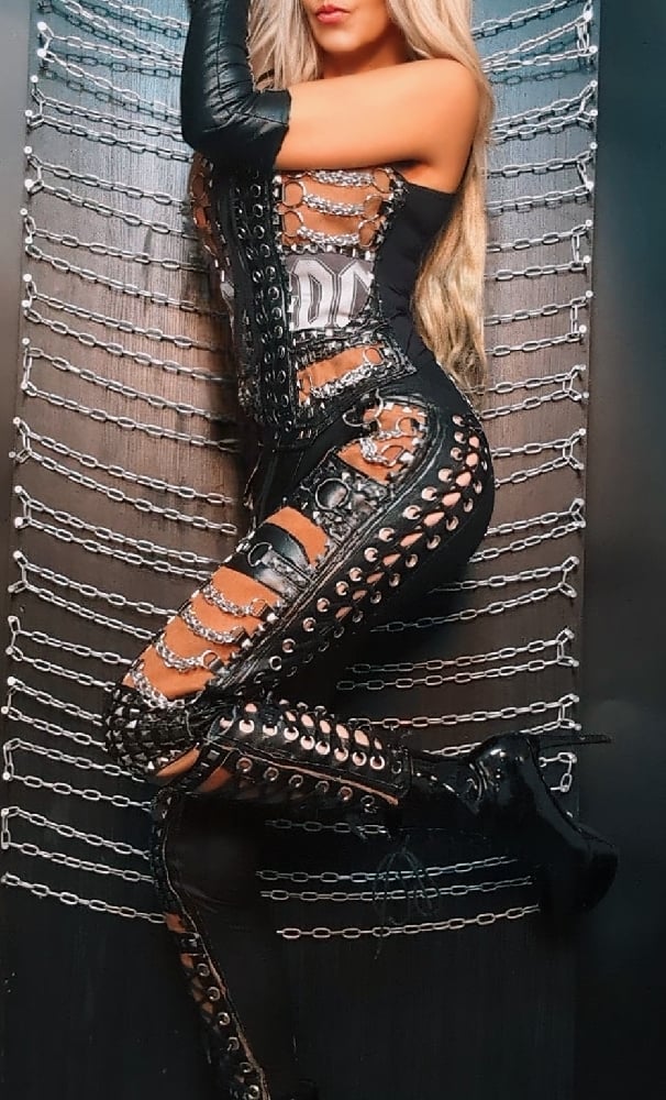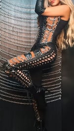 Judas Christ one of a kind wet look faux leather suedette leggings / pants. Mid waisted, lace up front, stretchy, covered in studs chain and rivets with v back panel.